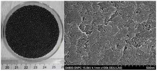 毫米級介孔碳球的數碼照片和表面高分辨SEM照片