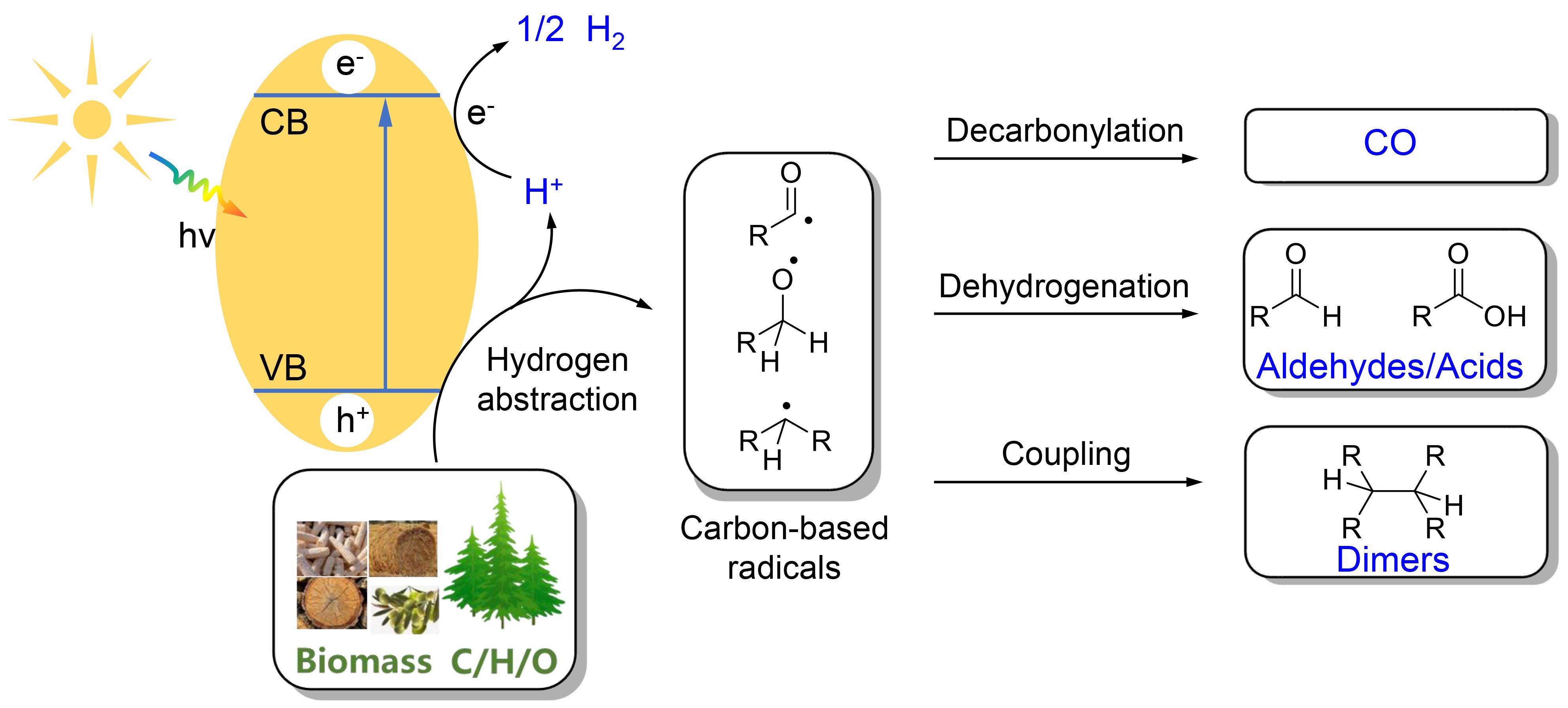 氫氣(H2)是一種可以有效減少全球碳排放的清潔能源。以可再生生物質為原料實現綠色H2的可持續生產,受到了學術界和各國政府的廣泛關注。太陽能驅動的光催化技術逐漸被認為是一種高效可行的生物質制氫技術,但該過程中生物質中的碳往往被深度降解為CO2。人類社會不僅需要清潔能源,還需要各類碳基化學品與燃料,將生物質通過光催化技術同時轉化為H2與可再生碳基化學品是一種更可持續、經濟的方式。