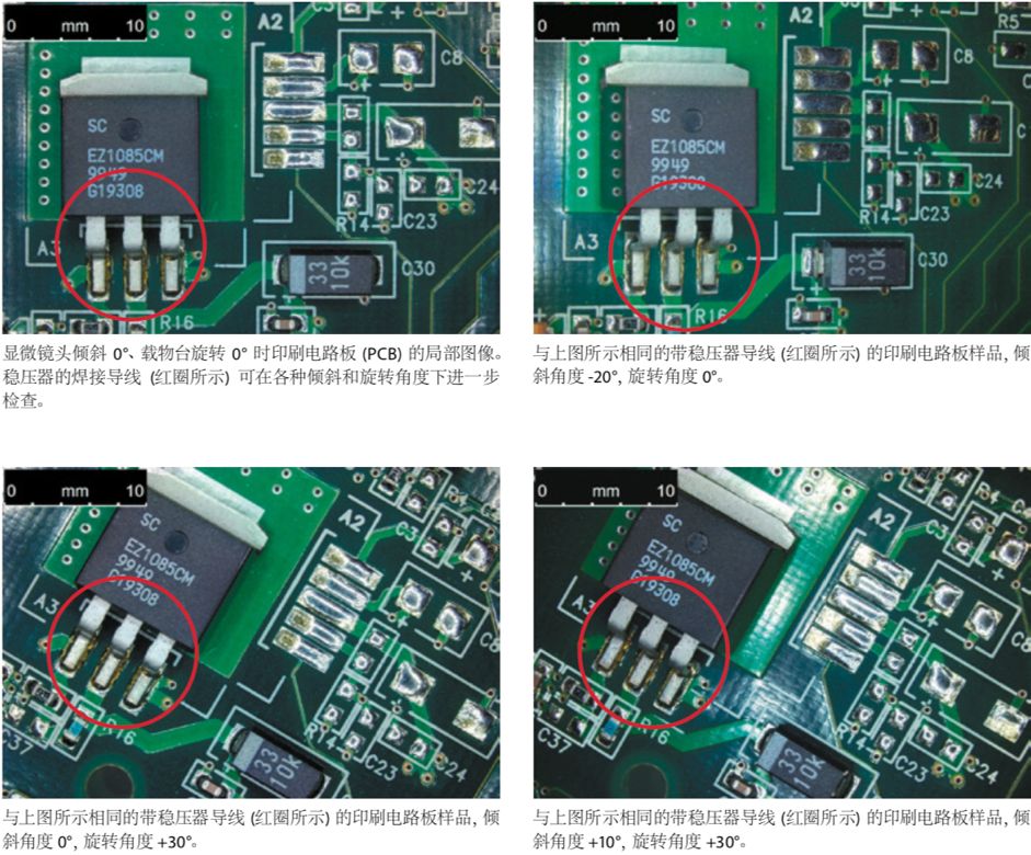 顯微鏡頭傾斜和載物臺旋轉 快速、可靠的印刷電路板檢查工作流程往往需要從不同角度查看其復雜的 3D 組件,如放大器、穩壓器、晶體管、二極管、電容器及各種組件。Leica DVM6 數字顯微鏡配有傾斜主鏡裝置 (-60° 至 +60°) 和旋轉樣品載物臺 (-180° 和 +180°)。 下面顯示的是以不同觀察角度記錄的印刷電路板圖像示例。在檢查組件時,不同的觀察角度非常重要;例如,紅圈所示的穩壓器焊接導線。改變觀察角度可以查看導線和組件的不同部位,而這些部位在角度固定的頂視圖中是“隱藏”的 (0° 傾斜)。