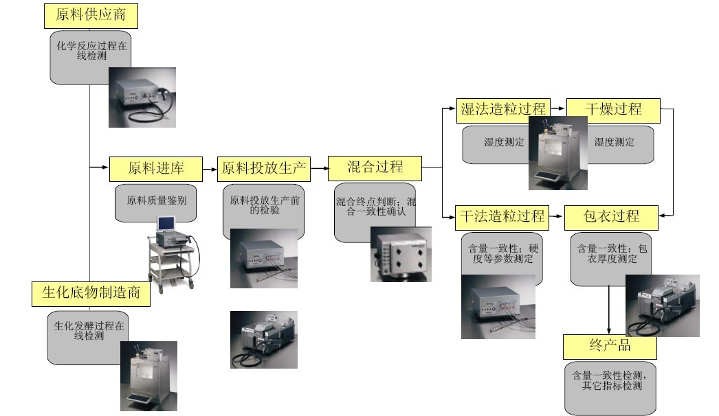 在制藥行業中近紅外技術得到了廣泛應用,特別是美國FDA很倡導使用近紅外技術作為企業內部質量控制的手段。成熟的近紅外方法可以只需花費一分鐘時間就能夠完成其他方法需要花費幾天才能完成的分析任務。目前,近紅外技術幾乎滲透了制藥行業不同工藝的每個環節,從下圖可以看出:從原料供應商到原料進庫、原料投放、原料混合,直至干法濕法造粒等,直到終產品,每個環節都有近紅外的獨特運用。
