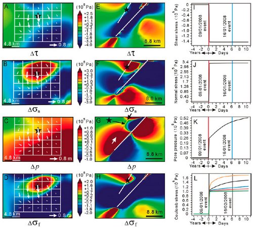 研究首先根據歐洲航空航天局Envisat衛星的空間對地觀測數據,用InSAR技術獲取該地震序列在衛星視向上(LOS)的高精度地表變形。基此,反演得到了主地震(09/01/2008 Ms=6.4)和余震(16/01/2008 Ms=5.9)破裂的幾何學與運動學。通過建立固體+流體(Biot’s solid)耦合求解的多物理場模型,模擬了地震發生后因流體運動所導致的近場庫侖應力在時間上的變化,從而解釋了尼瑪地震序列中主地震對余震觸發的動力學機制。